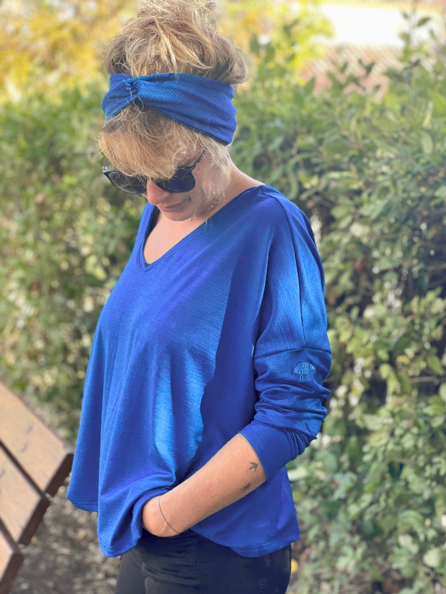 On l’enfile, il tombe. Ce top oversize femme glisse, ne colle pas, suit les mouvements sans tirer. Porté côté col rond ou côté décolleté en V arrondi, il change de ligne. Le logo est brodé sur la manche pour permettre de le porter dans un sens comme dans l’autre.